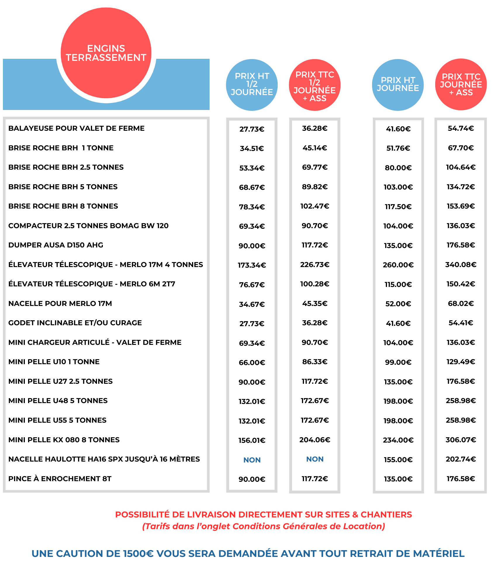 ENGINS TERRASSEMENT S’adapter à vos projets ! TARIFS DEMI-JOURNÉE & JOURNÉE LIVRAISON EN SUPPLÉMENT TARIFS DEMI-JOURNÉE & JOURNÉE LIVRAISON EN SUPPLÉMENT LE DUMPERChargeur avec benne rotative à 180° Capacité de charge jusqu’à 800 litres Tout terrain – Traction 4×4 Système déchargement : giratoire Largeur : 1m48 Hauteur : 2m44 Poids : 1T5 LE MERLO 17 MÈTRESChariot téléscopique jusqu’à 17 mètres Disponible avec fourches ou nacelle Hauteur de cabine : 251 cm Largeur de voie : 240cm Hauteur levage maxi : 1670 cm Longueur : 579 cm LE MERLO 6 MÈTRESChariot téléscopique jusqu’à 6 mètres Disponible avec fourches ou nacelle Hauteur de cabine : 192 cm Largeur de voie : 184 cm Hauteur levage maxi : 6 m Capacité de levage : 2700 kg Poids : 5T LE VALET DE FERMEDisponible avec : – Godet à terre – Godet crocodile – Fourches à palettes – Balayeuse LA MINI PELLE U10Mini pelle 1 Tonne Chenilles rétractables 75 à 99 cm Disponible avec 3 godets – Godet de terrassement – Godet de curage – Godet câble LA MINI PELLE U27Mini pelle 2T7 Hauteur de cabine 243cm Largeur de voie 150cm Disponible avec 3 godets – Godet de terrassement – Godet de curage – Godet câble LA MINI PELLE U55Mini pelle 5 Tonnes Hauteur de cabine 255 cm Largeur de voie 196 cm Disponible avec 3 godets – Godet de terrassement – Godet de curage – Godet câble LA MINI PELLE U48Mini pelle 5 Tonnes Hauteur de cabine 255 cm Largeur de voie 196 cm Disponible avec 3 godets – Godet de terrassement – Godet de curage – Godet câble Godet inclinable sur demande et selon disponibilité LA MINI PELLE KX80 Mini pelle 8 Tonnes Hauteur de levage maximun 706 cm Largeur de voie 220 cm Disponible avec 3 godets – Godet de terrassement – Godet de curage – Godet câble Godet inclinable sur demande et selon disponibilité LA NACELLE HAULOTTENacelle autoportée jusqu’à 16 mètres Utilisation à plat Devers adimissible 5° Largeur de voie 2300 cm Charge jusqu’à 230 kg LE COMPACTEUR BOMAGLargeur bille 100 ou 120 cm Hauteur 270 cm Poids 2 Tonnes 470